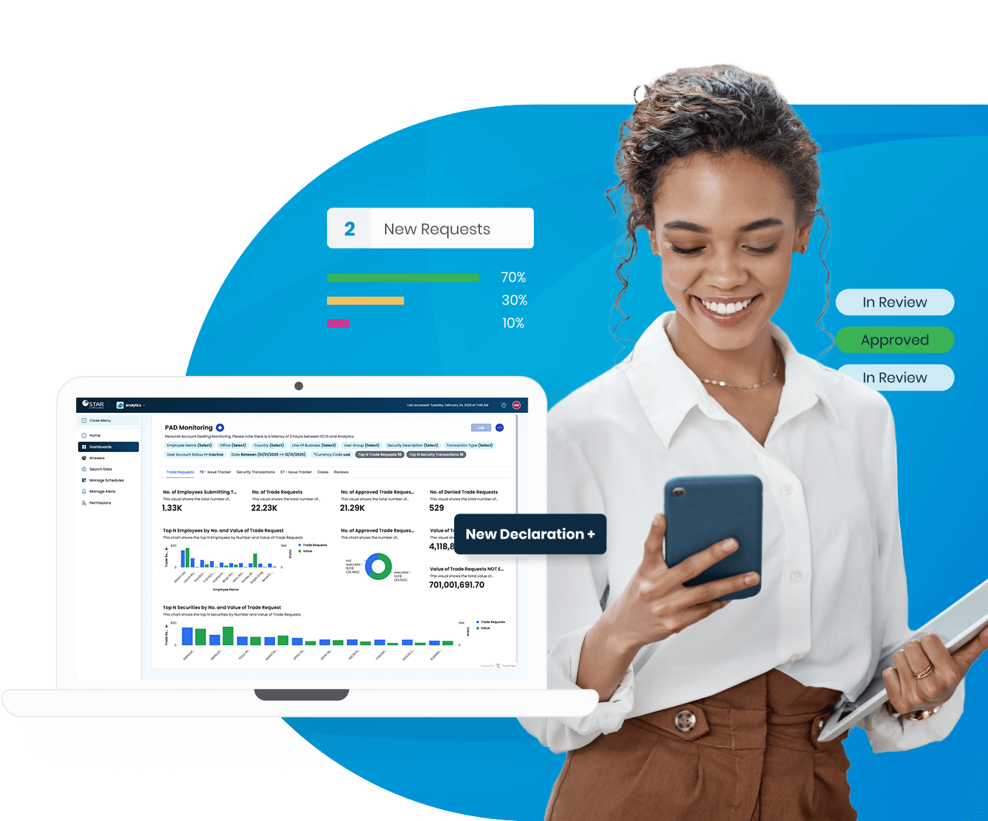 With STAR Mobile, employees pre-clear activity and report transactions on-the-go and Supervisors can review escalated requests from anywhere.